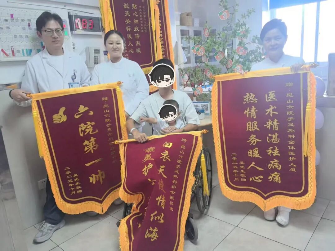 日前,吳先生(化名)將三面飽含感激之情的錦旗,鄭重送到昆山市第六人民醫(yī)院手足外科醫(yī)護團隊手中,感謝醫(yī)護人員對他及家人的貼心照料與暖心關懷。