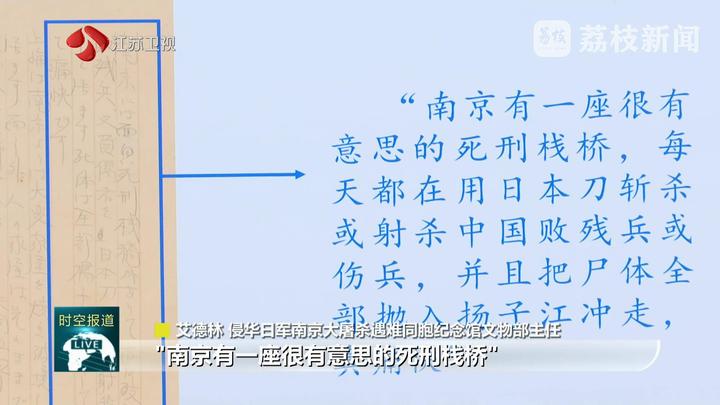侵華日軍南京大屠殺遇難同胞紀念館文物部主任艾德林說:“其中第二頁這樣寫道‘南京有一座很有意思的死刑棧橋’‘每天都在用日本刀斬殺或射殺’?!?/p>